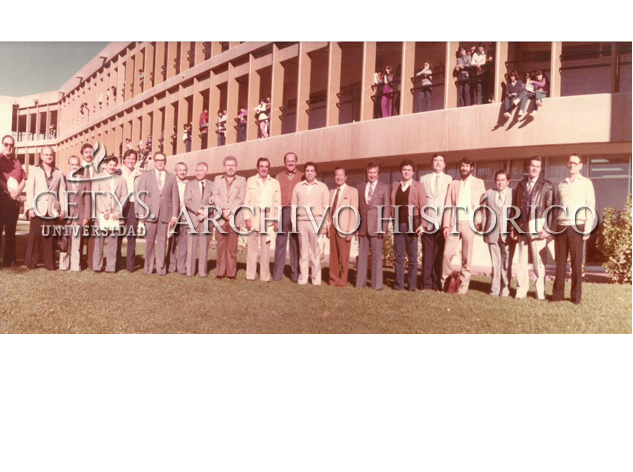 Resumen : Fotografía grupal de la Reunión del IENAC con autoridades del CETYS en la segunda mitad de los años setenta, fue tomada frente al Edificio de profesional en los Jardines de CETYS Campus Mexicali. Mencionando algunos integrantes se encuentran Sr. Mario Hernández Maytorena, Ing. Eugenio Elorduy Walther, Ing. Jesús Alfonso Marín Jiménez, Sr. Héctor Sada Quiroga, Ignacio A. Guarjardo, Ing. Enrique Carlos Blancas de la Cruz entre otros.